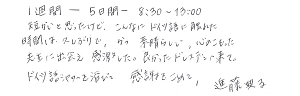は新市街の中で最も賑やかなルイゼンストラッセの近くにあります。目の前にはツタで覆われたルター教会と小さい広場があり、雑多な表通りとは少し違う空気が感じられます。教室はとてもアットホームな雰囲気で、個人のお宅へお邪魔しているような気持ちになります。私は子供 を伴ってプライベートレッスンを受けています。超初級から始めましたが、文法を中心としたポイントを絞ったわかりやすい授業と、適度な負荷がかかる程度の宿題を併せ、順調に学んでいます。できればグループレッスンで会話も経験してみたいと思っています。周辺にレストランやカフェなどがたくさんありますので、授業の後もきっと楽しめると思います。